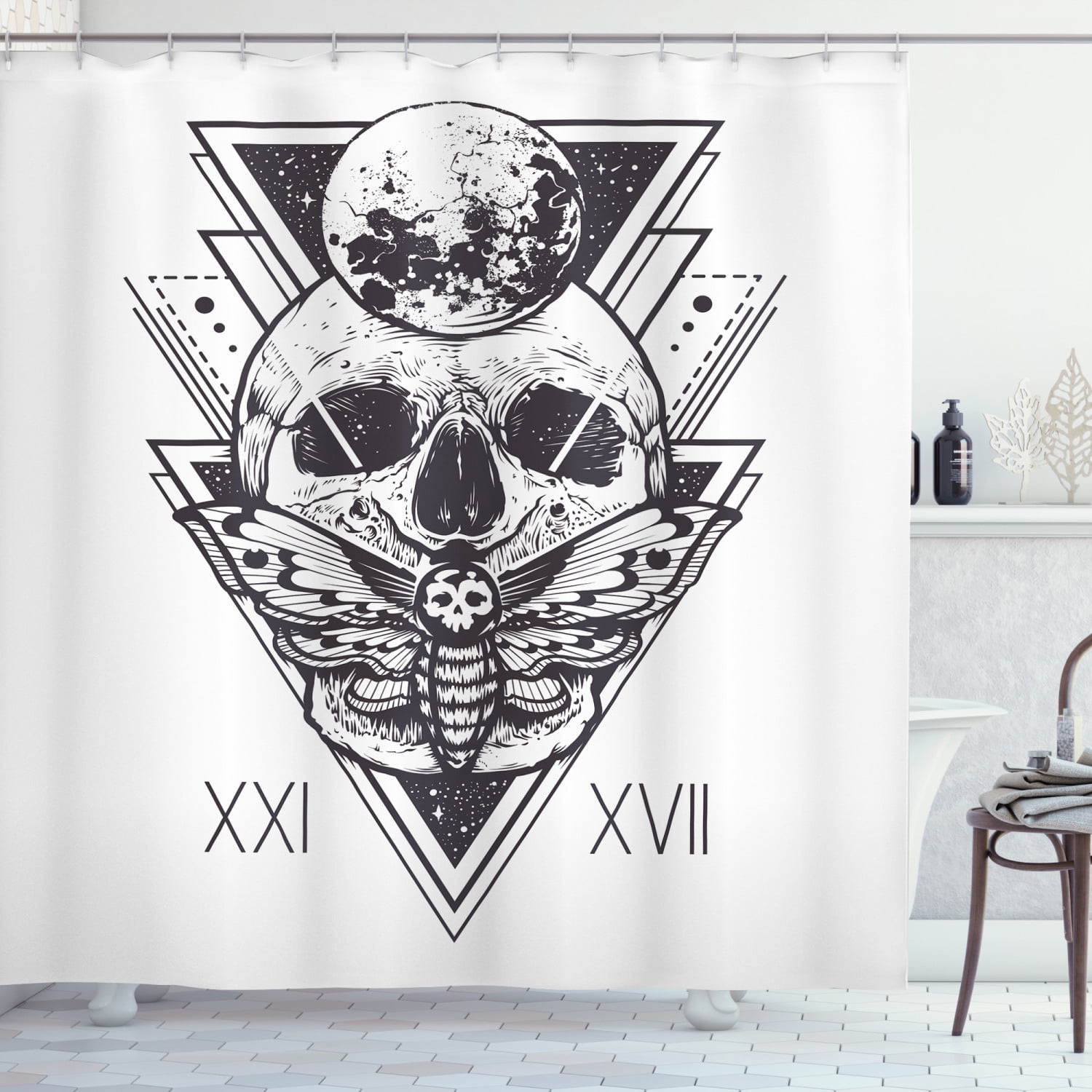 Death Moth Shower Curtain Sacred Geometry Skull Dead Head Alchemy Hipster Tattoo Style Art Fabric Bathroom Set With Hooks 69w X 75l Inches Long White And Dark Blue Grey By Ambesonne